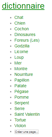 Sur la page du dictionnaire vous allez retrouver la liste de tout les articles qui ont étés créés par les enfants. Au bas de cette liste on peut voir un bouton Créer une page….